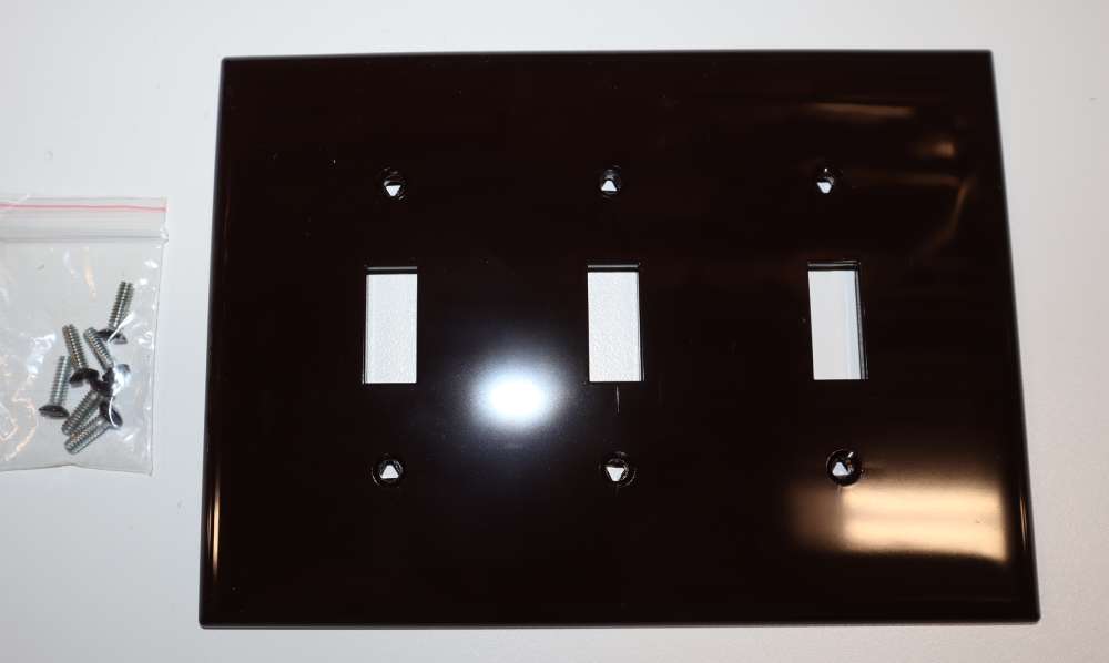 Wallplate; Configuration (3) Toggle Switch; Number of Gangs 3; Designated Size Mid; Material Polycarbonate; Color Brown; Finish High Gloss; Approval UL (Canada and US), UL 514D; Temperature Rating -40 to 158 Deg F; Size 6.75 Inch W x 4.87 Inch H; With Matching Mounting Screw; ROHS Compliant