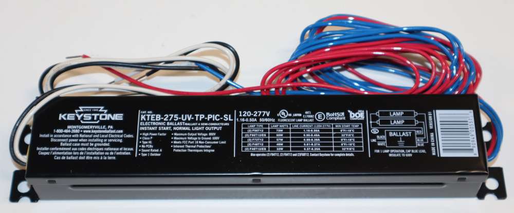 Fluorescent Electronic Ballast; Starting Type Instant Start; Lamp Type F48T12; Number of Lamps 2; Lamp Wattage 75 W; Input Voltage 120 to 277 VAC; Input Current 0.6 Ampere at 120 VAC, 0.26 Ampere at 277 VAC; Input Power 64 W; Frequency Rating 50/60 Hz; Power Factor 0.99; Ballast Factor 0.92; Maximum THD 12 Percent; Wiring Parallel; Minimum Starting Temperature -18 Deg C
