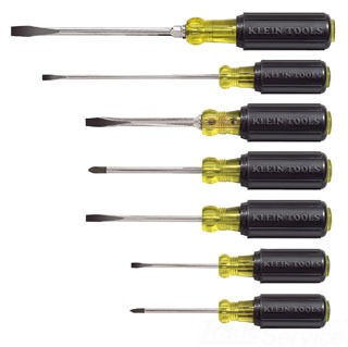 Handle Type Cushion Grip; Applicable Standard ASME/ANSI This 7-Piece Klein Tools Screwdriver Set contains the most frequently used, general purpose screwdrivers. Included are three cabinet-tip, two Phillips-tip, and two keystone-tip style screwdrivers. Each screwdriver features Klein's patented Tip-Ident which allows quick identification of the type of screwdriver and tip orientation.