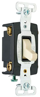 External Screw Pressure Plate Back and Side Wired Accepts #14 to #10 AWG Copper or Copper Clad Conductors; Heavy Gauge One Piece Copper Alloy Contact Arm Virtually Eliminates Contact Bounce; Cam Controls Fast Make and Positive Break to Minimize Arcing; Heavy Duty Bumper Pads for Quiet Operation; High Strength Thermoplastic Polycarbonate Toggle; Back Body Made of Glass Reinforced Nylon; Locking Support Provides Resistance to Face and Back Body Separation; Oversized Silver Alloy Contacts for Long Life and Better Heat Dissipation; Grounding Terminal is Standard; Shallow Design for Ease of Installation; Strap Nickel Plated Steel with Integral Ground; Auto Ground Clip Assures Positive Ground