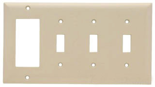 Molded of Non-Combustible Mar-Proof Material; Individually Wrapped with Color-Matching Screws; Resistant to Discoloration, Grease, Oil, Solvent and Moisture 4-Gang, Ivory, Smooth, Thermoset Plastic, Toggle Switch, Decorator, Combination, Standard, Wall Plate Overall Dimension 8.125 Inch W x 4.5 Inch H; Mounting Type Screw Mount; Application Commercial, Industrial and Residential; Approval UL 514, CSA