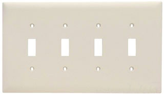 Wall Plate; Configuration (4) Toggle Switch; Number of Gangs 4; Designated Size Jumbo; Material 0.07 Inch Thk Nylon; Color Light Almond; Overall Dimension 8.75 Inch W x 5.0625 Inch H; Mounting Type Screw Mount; Application Commercial, Industrial and Residential; Approval UL (Canada and US)