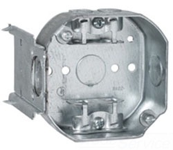 Octagon Box; Type Ceiling/Wall Lighting Fixture; Depth 1-1/2 Inch; Diameter 4 Inch; Capacity 15.5 Cu Inch; Shape Octagon; Number of Knockouts 7; Knockout Location (1) Bottom, (6) Sides; Knockout Size (1) 1/2 Inch Conduit Bottom, (4) Cable Sides, (2) 1/2 Inch Conduit Sides; Material 0.0625 Inch Pre-Galvanized Steel; Mounting 3/8 or 1/2 Inch Setback J Bracket; Clamp Type Armored Cable/Flex/Metal Clad; Approval UL 514A, CSA C22.2; Standard Package 50; Applicable Standard ANSI, NEMA OS1