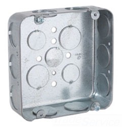 Square Box; Type Drawn; Height 4-11/16 Inch; Width 4-11/16 Inch; Depth 1-1/2 Inch; Capacity 29.5 Cu Inch; Number of Knockouts 15; Knockout Location (5) Bottom, (10) Sides; Knockout Size (3) 1/2 Inch Conduit Bottom, (2) 3/4 Inch Conduit Bottom, (10) 3/4 Inch Conduit Sides; Material 0.0625 Inch Pre-Galvanized Steel; Standard Package 25; Approval UL 514A, CSA C22.2; Applicable Standard ANSI, NEMA OS1