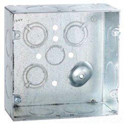 Square Box; Type Welded; Height 4-11/16 Inch; Width 4-11/16 Inch; Depth 2-1/8 Inch; Capacity 42 Cu Inch; Number of Knockouts 13; Knockout Location (5) Bottom, (8) Sides; Knockout Size (1) 1/2 Inch Conduit Bottom, (1) Conduit Bottom, (3) (1/2 Inch - 3/4 Inch) Conduit Threaded Knockout Bottom, (4) 3/4 Inch Conduit Sides, (4) 1 Inch Conduit Sides; Material 0.0625 Inch Pre-Galvanized Steel; Standard Package 25; Approval UL 514A, CSA C22.2; Applicable Standard ANSI, NEMA OS1