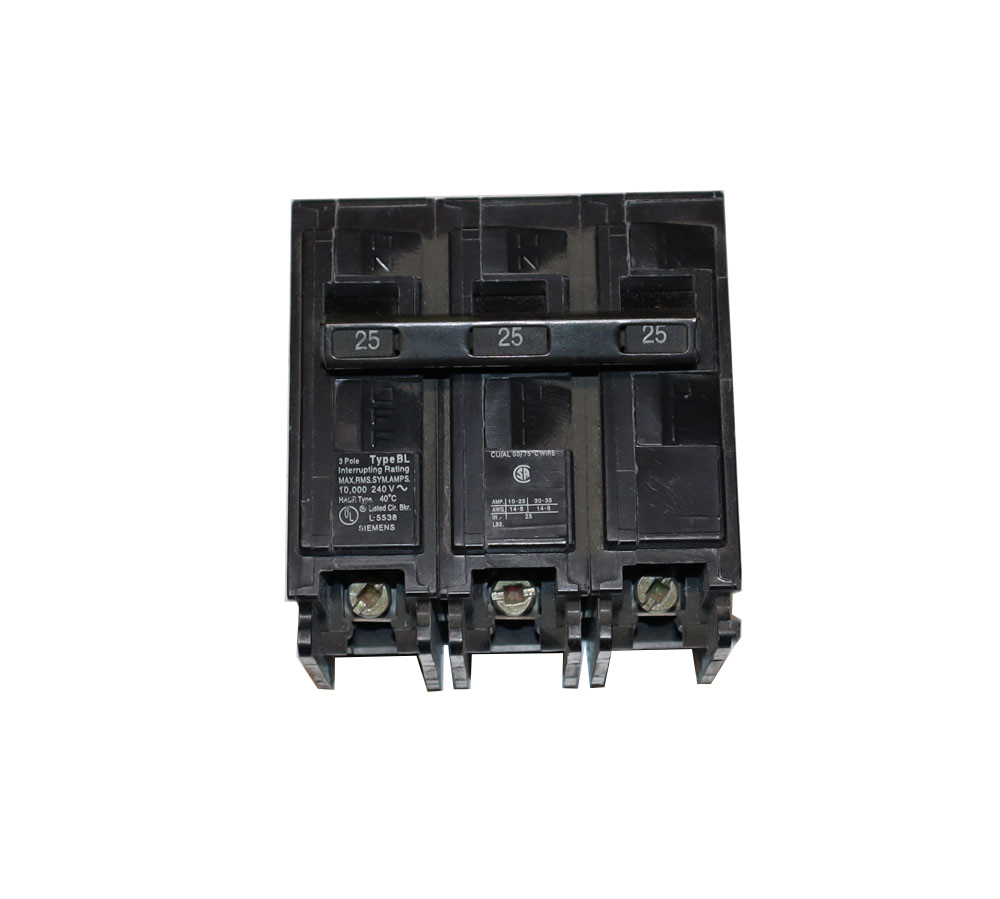 Panelboard Circuit Breaker; Type Molded Case, Thermal and Fixed Magnetic; Voltage Rating 240 VAC at 50/60 Hz (UL); Current Rating 25 Ampere at 40 Deg C; Number of Poles 3; Interrupting Rating 10 Kiloampere at 240 VAC (UL); Installation Bolt-On; Application Lighting, Distribution; Used On P1/P2/P3/P4/P5 Panelboard; Approval UL 489, CSA C22.2; Frame Type BL; Terminal Type Load Lug; Size 3 Inch W x 3 Inch D x 3-9/16 Inch H